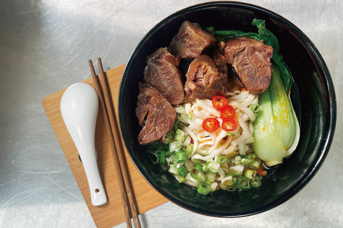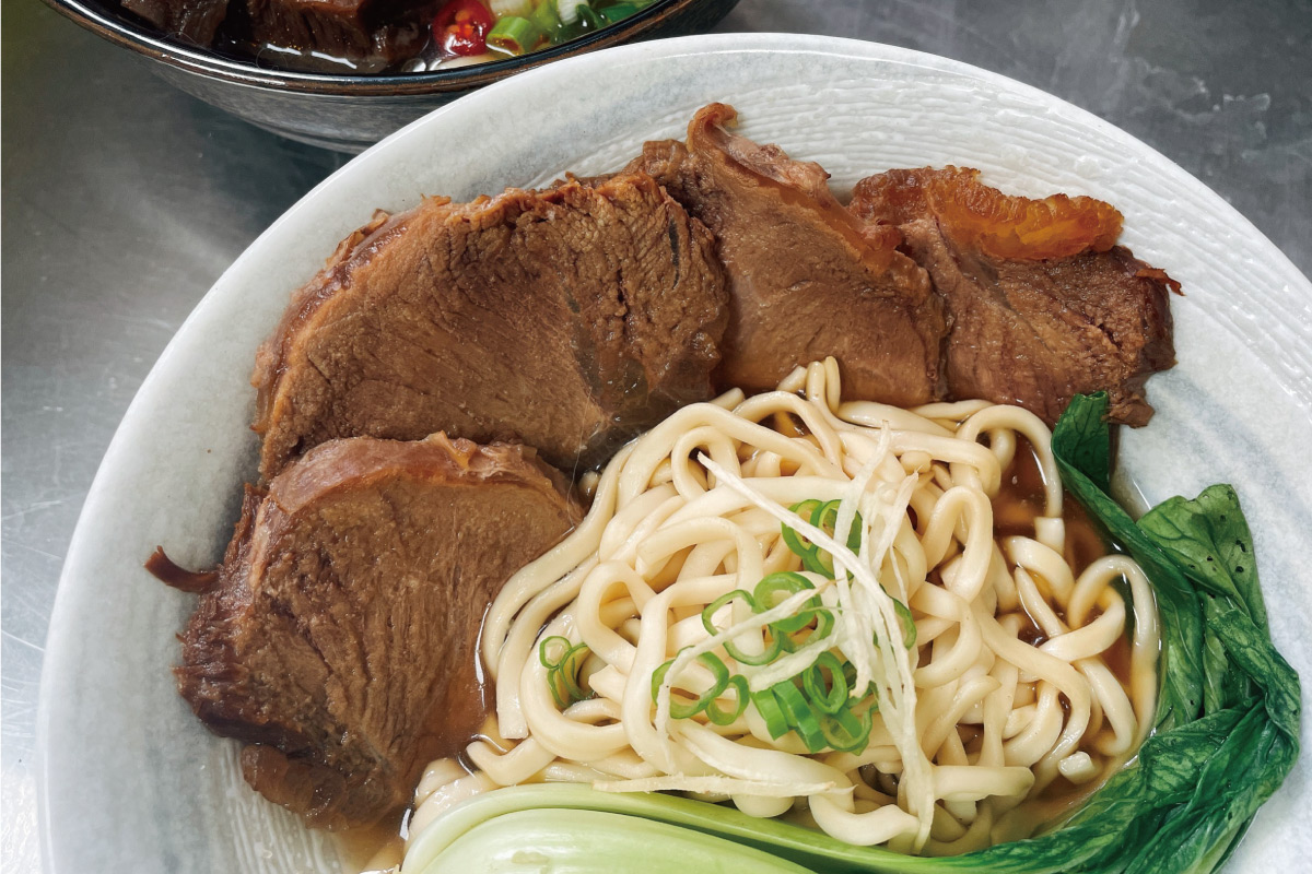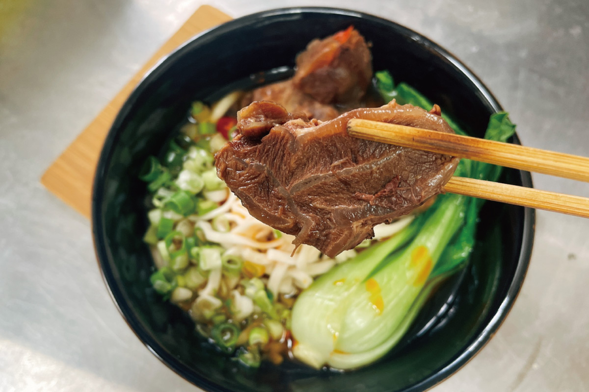 混董創食 紅燒花腱牛肉麵,相較於一般牛腱,使用筋膜比例較高的精華部位,肉中帶油花軟內入味。
