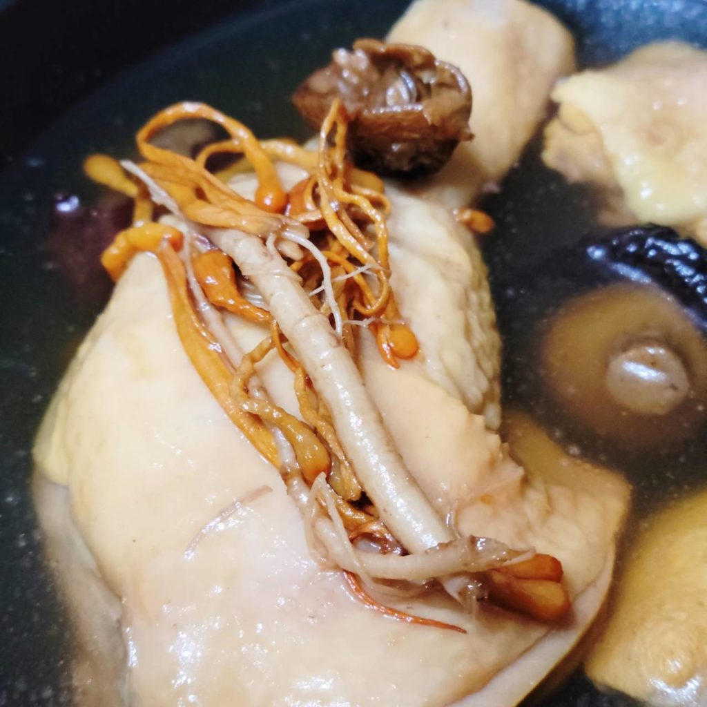 以黃耆、當歸、瑤柱、巴西蘑菇、乾香菇、人蔘鬚、蟲草花等菇類、藥膳煨煮而成