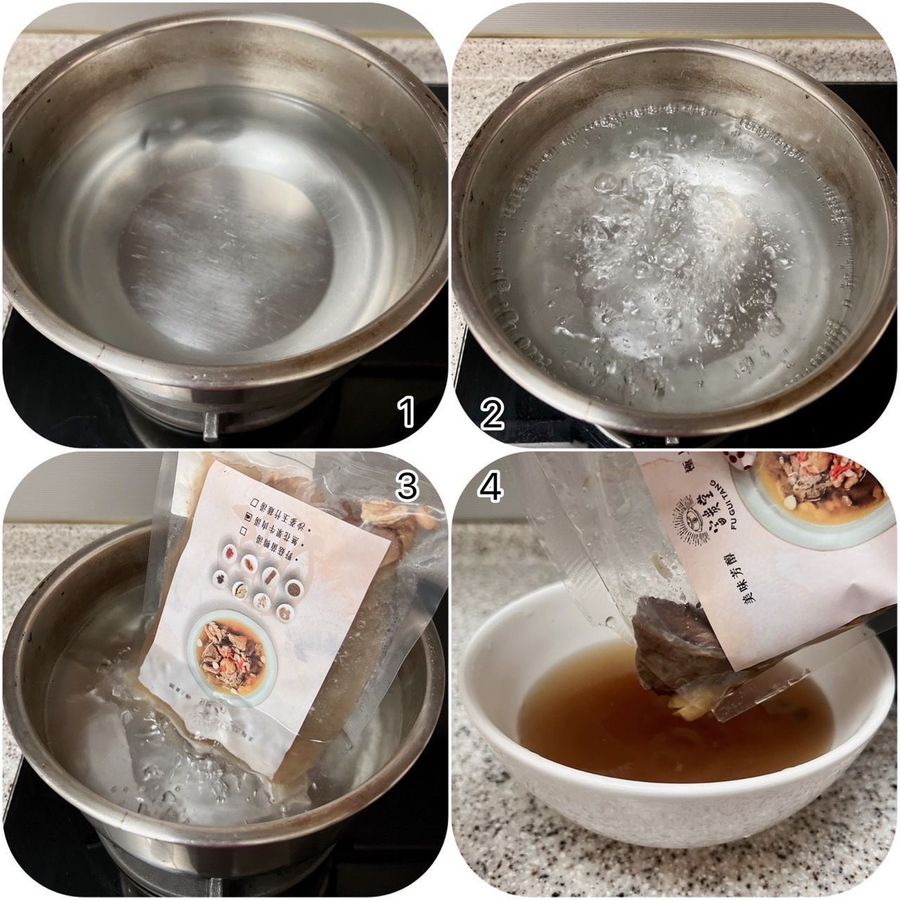 須解凍狀態,拆封倒入鍋中以大火煮滾,關火後靜置約五分鐘即可食用