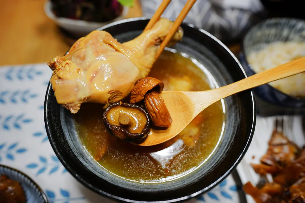 混董煨湯禮盒組內三款湯品,我個人最喜歡的是野菇菌雞湯,它是當歸湯底,超肥美大雞腿再搭配各種蕈菇,尤其裏頭有多汁的巴西蘑菇讓人驚艷!